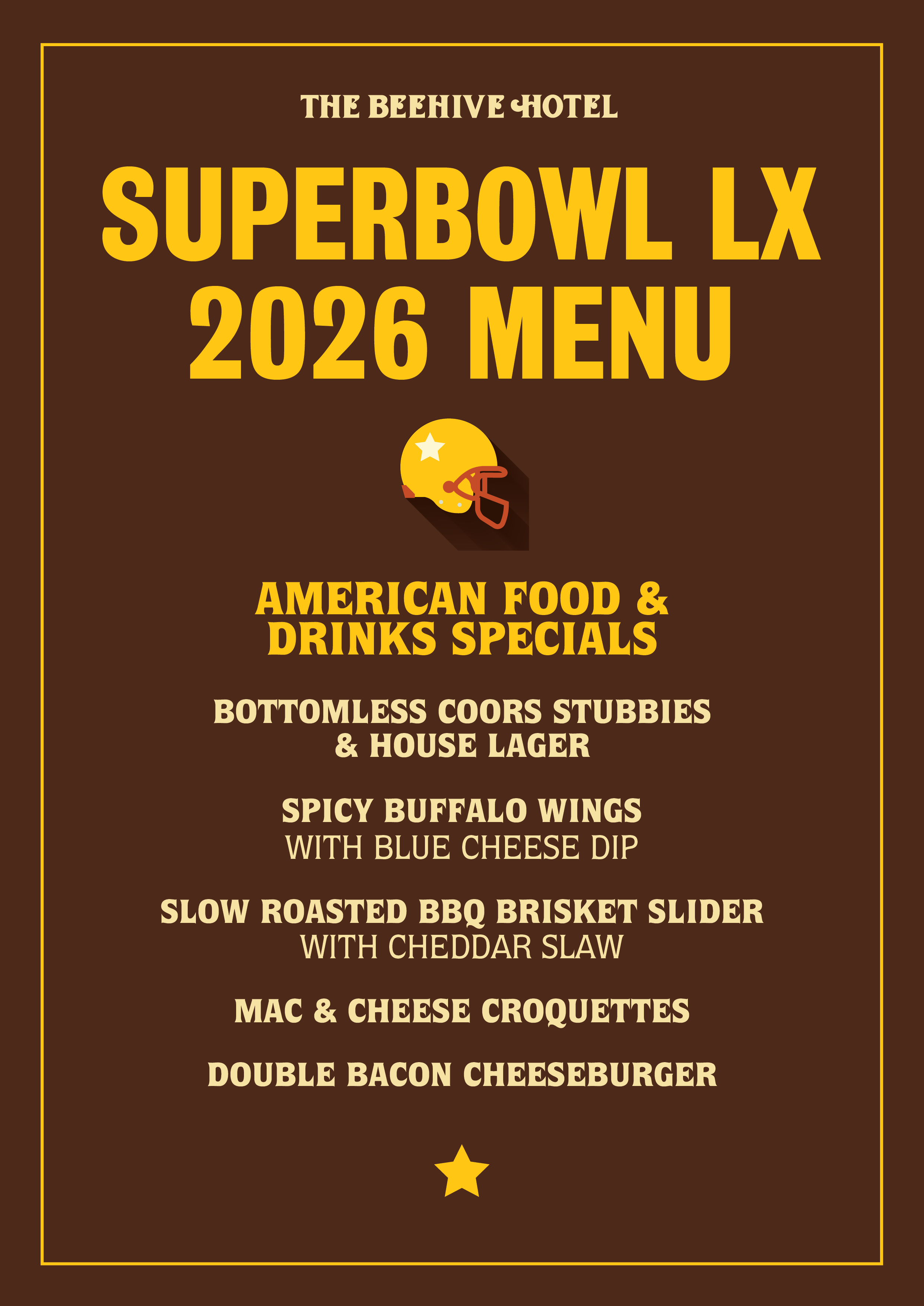 Superbowl Superbowl 9th Feb 2026 Tailgate street partyDoors open from 9am $150pp bottomlessfood and drink packageAmerican beers & food specials RESERVE NOW